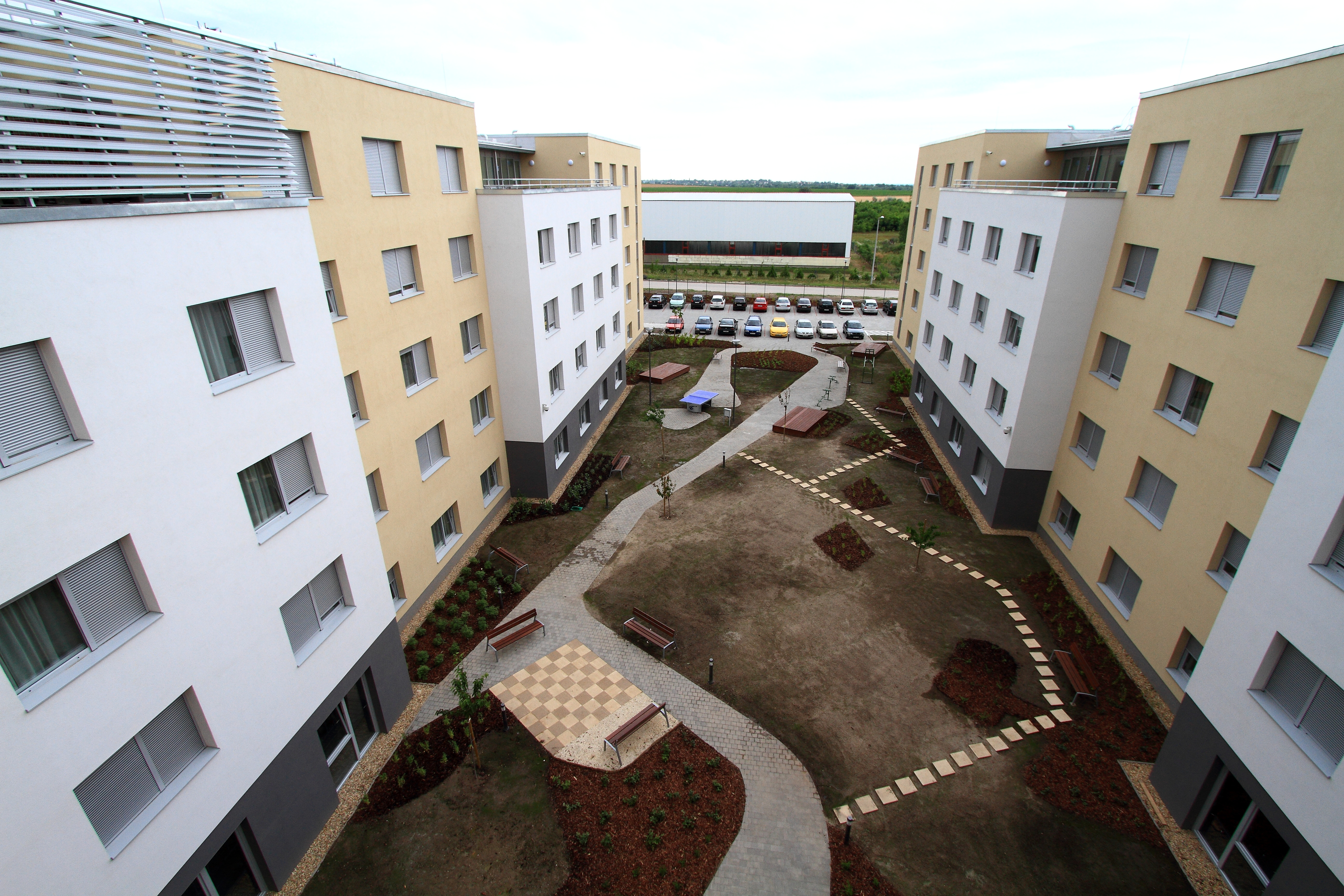 The Hankook Dormitory is a genuine workers’ accommodation facility located on the northern outskirts of Dunaújváros, in close proximity to the Hankook Tire Hungary Ltd. tyre manufacturing plant. Based on the information received during the design phase, we strived to ensure that the advanced technology and high standards represented by the Client would also be reflected in the quality and design of the dormitory. This is a modern, high-quality building aligned with the principles of Feng Shui, offering comfort and services comparable to a four-star hotel. It serves as a comprehensive complex supporting the rest and leisure activities of workers employed in three shifts.
