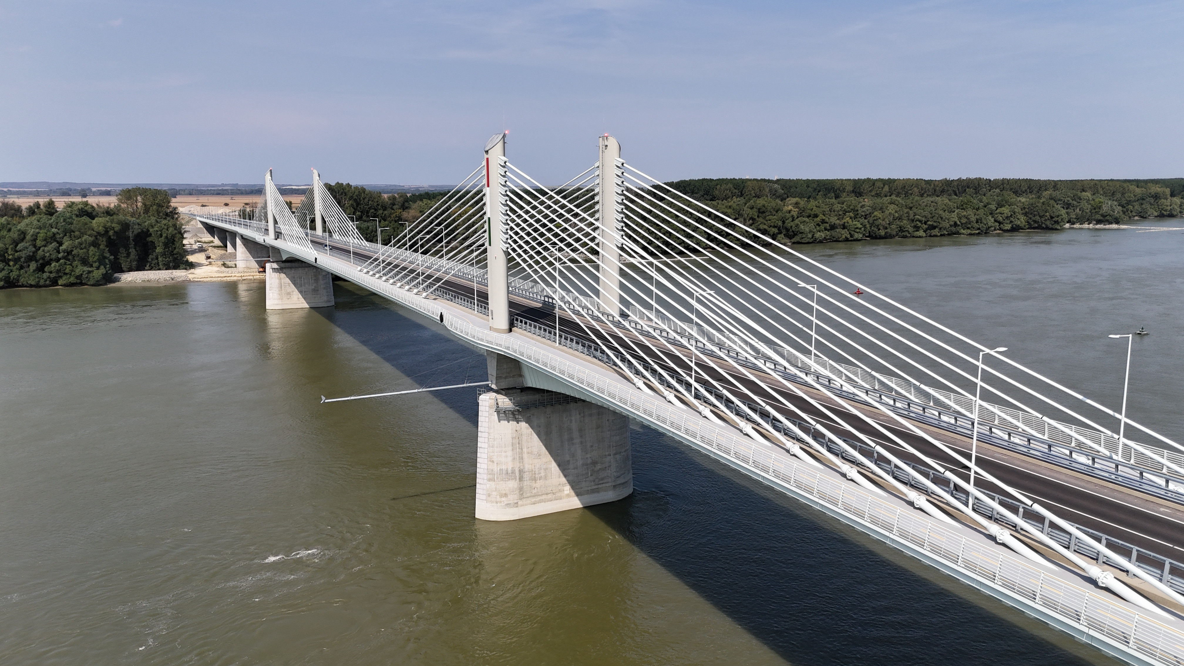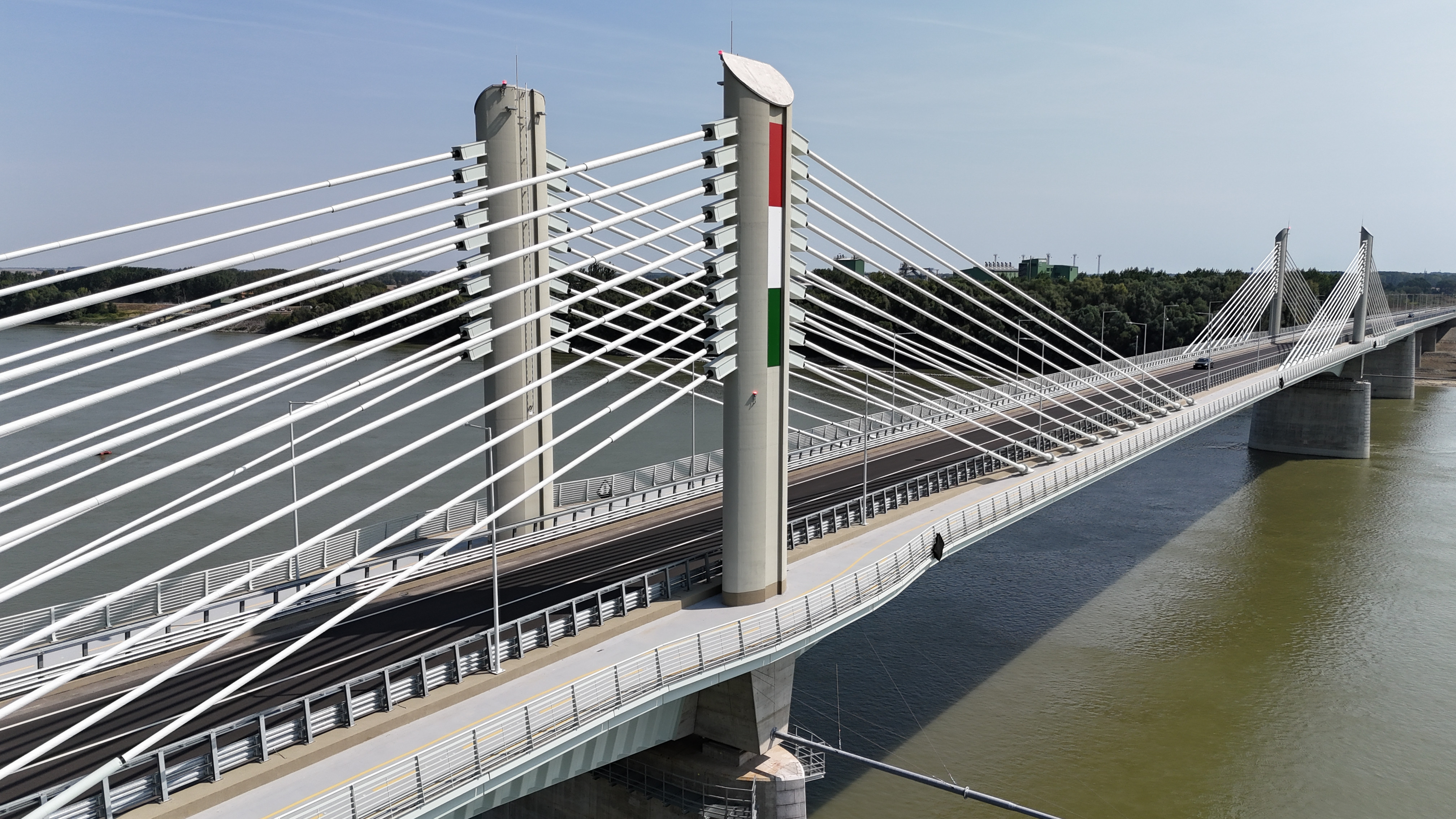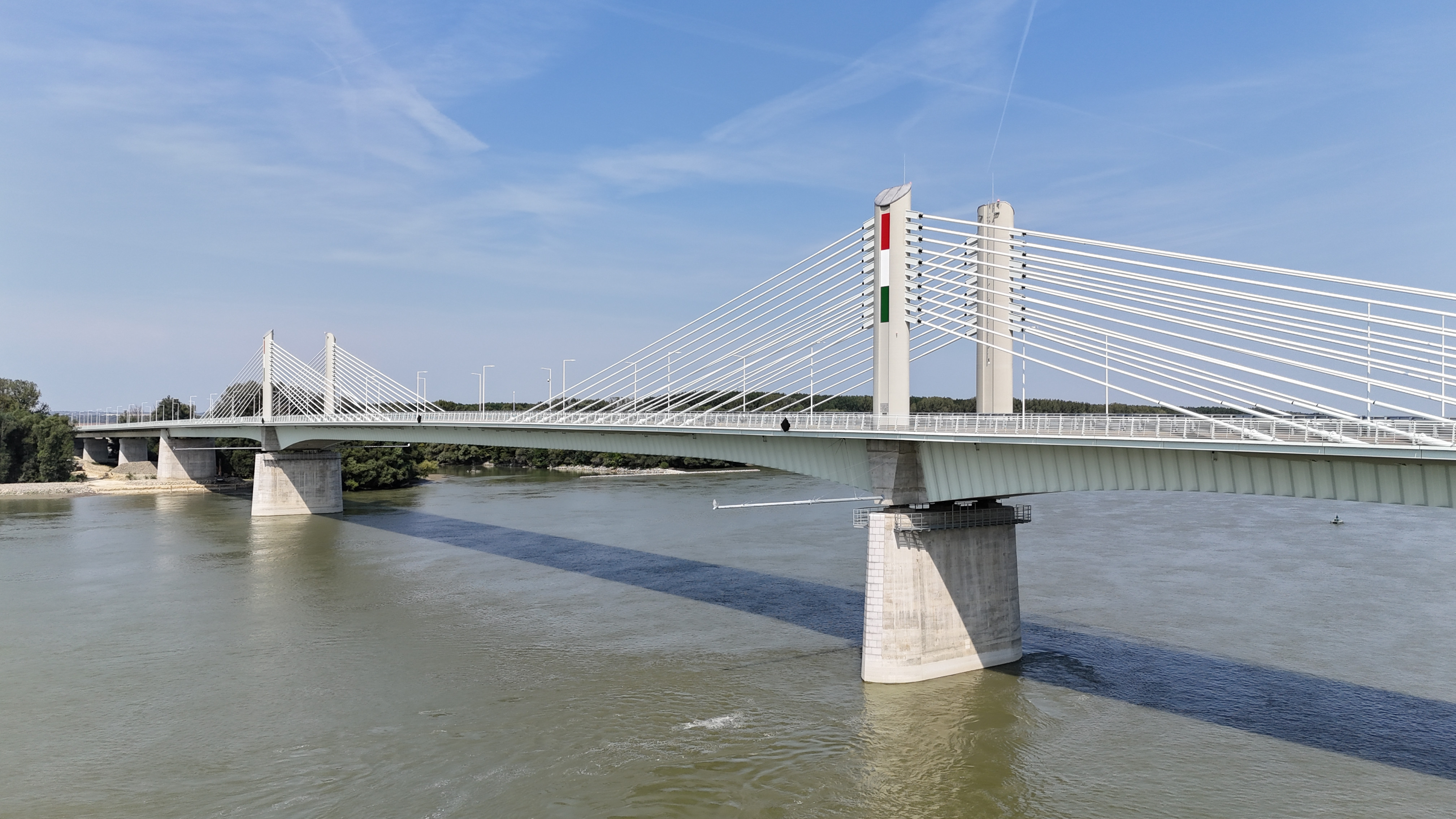 The superstructure of the 440-meter-long extradosed (prestressed and cable-stayed) river-bridge has 3 spans with parabolic arches above the river piers. The main load-bearing element is a twin-cell box girder, where the sloped and middle walls consist of trapezoidal steel sheets, while the upper part is a cantilever floor slab made of reinforced concrete. Concerning the construction and structural loads, the superstructure is constructed of a reinforced concrete floor slab with prestressed longitudinal cables and fixed inserts, while tensioned sliding cables run freely in the box girdle to counter the effects of the payload.