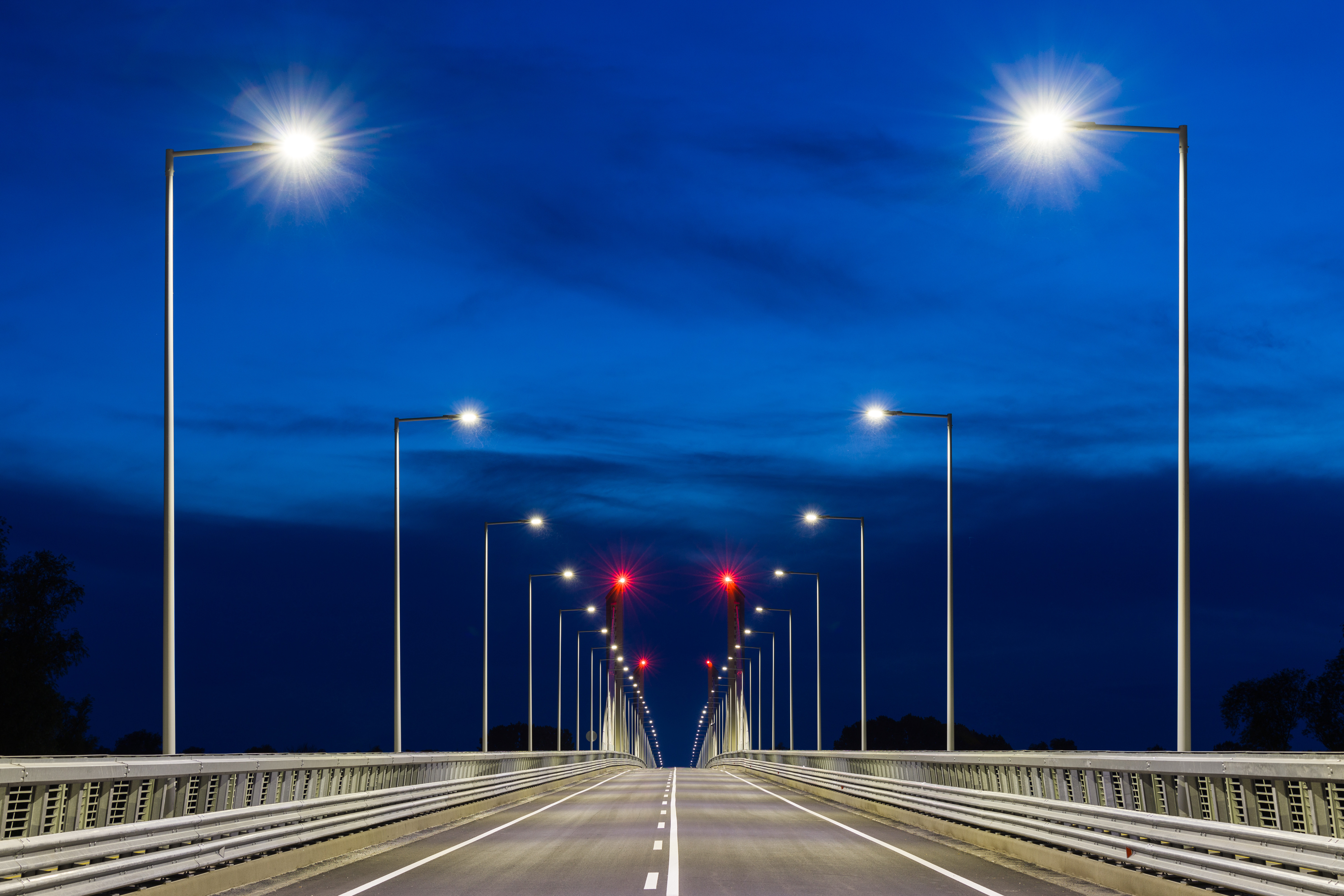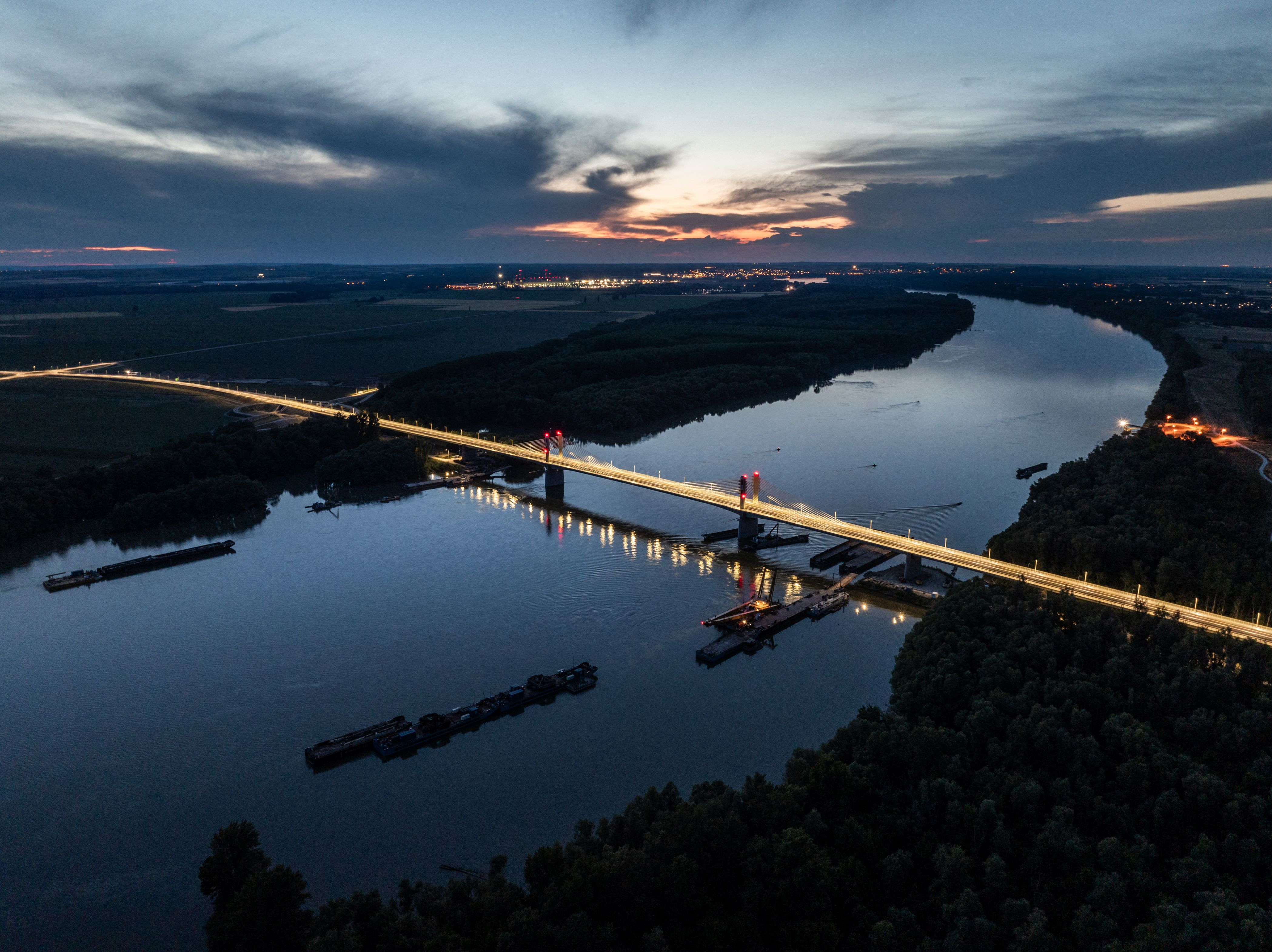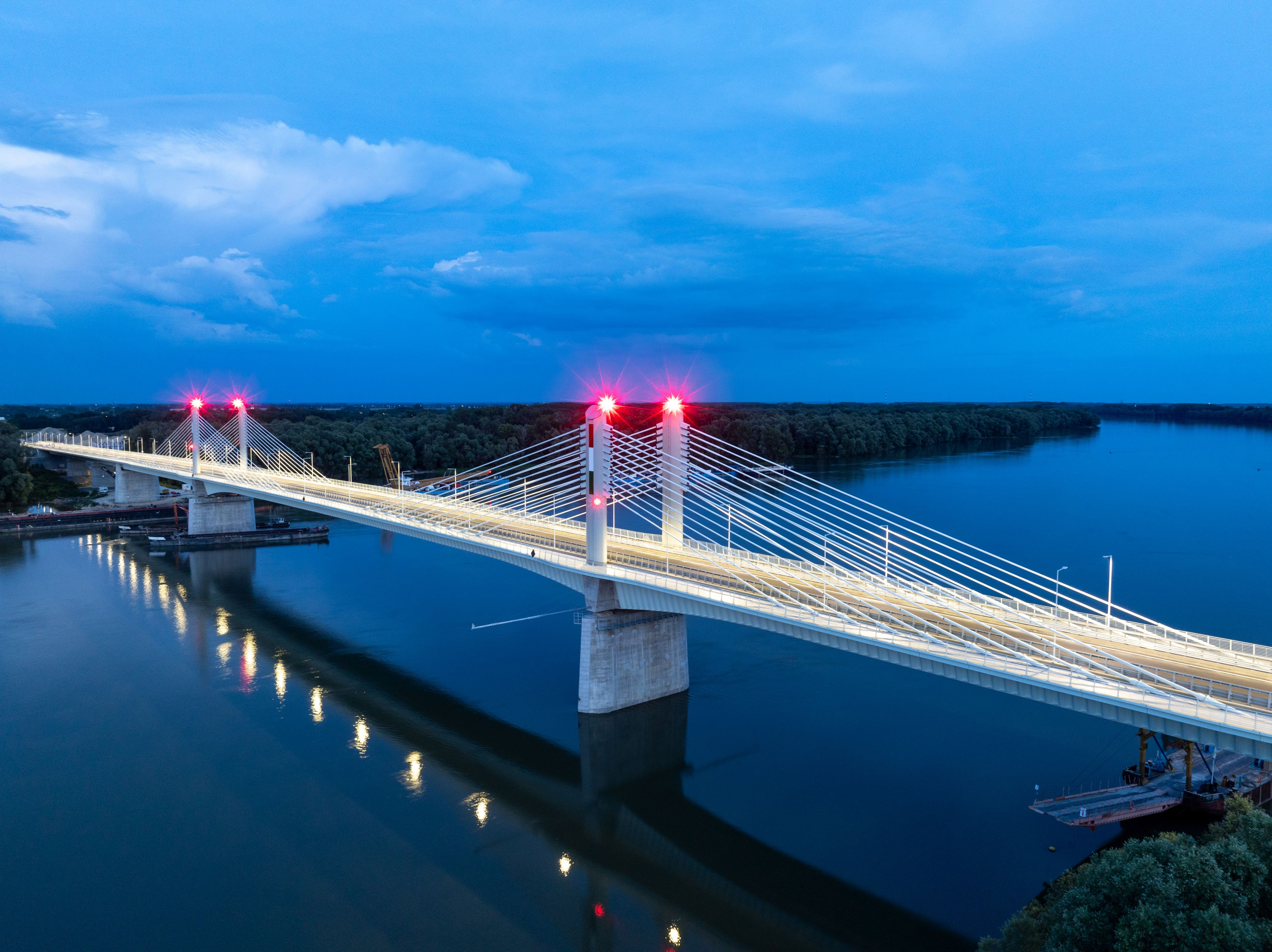 The superstructure of the 440-meter-long extradosed (prestressed and cable-stayed) river-bridge has 3 spans with parabolic arches above the river piers. The main load-bearing element is a twin-cell box girder, where the sloped and middle walls consist of trapezoidal steel sheets, while the upper part is a cantilever floor slab made of reinforced concrete. Concerning the construction and structural loads, the superstructure is constructed of a reinforced concrete floor slab with prestressed longitudinal cables and fixed inserts, while tensioned sliding cables run freely in the box girdle to counter the effects of the payload.
