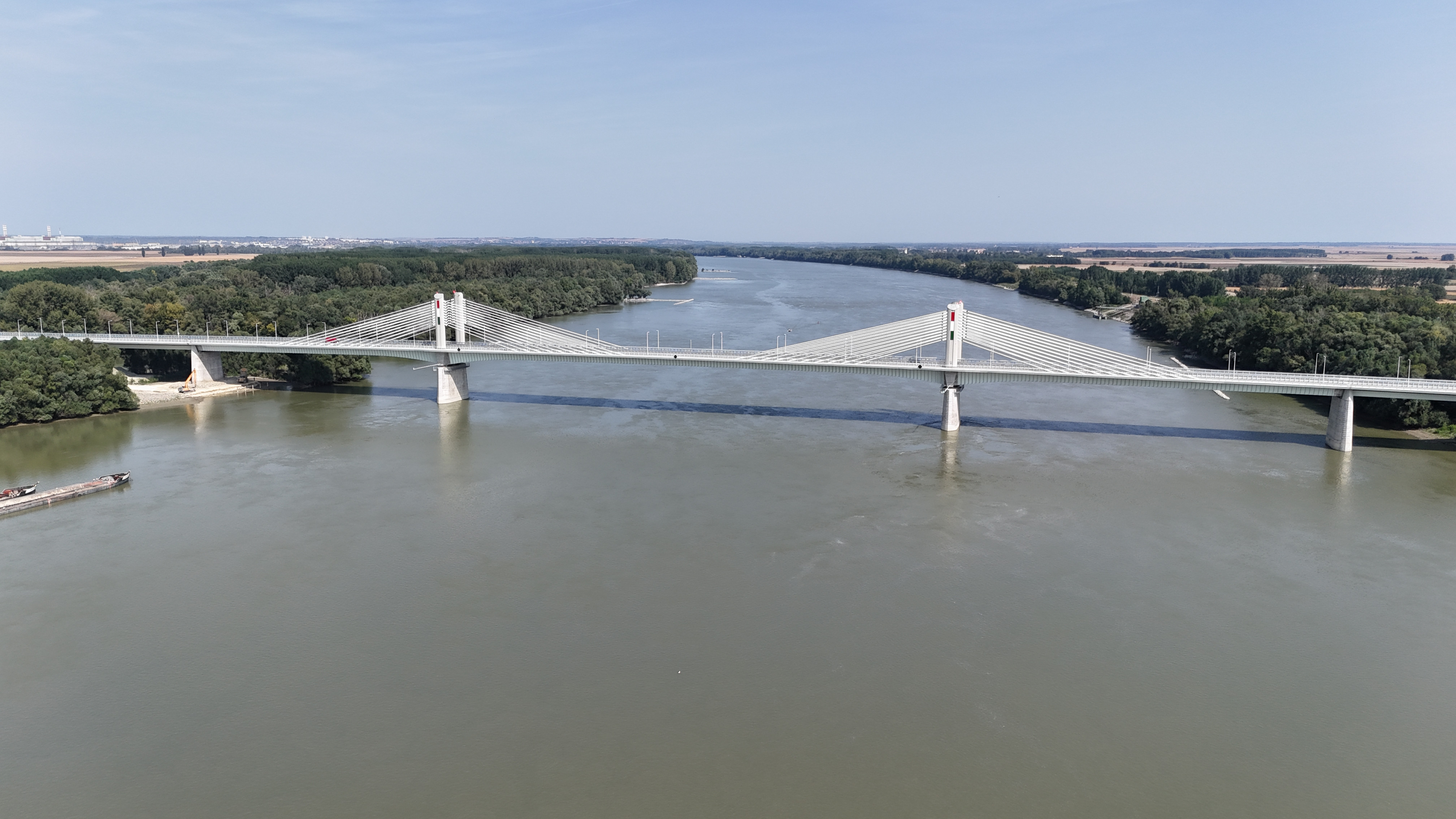 The new bridge crossing the Danube in the region of Paks and Kalocsa will have a uniform, artistic appearance despite its various types of structural elements. The bridge will have an approximate total length of 946 meters, and in addition to the public road with one lane in each direction, bidirectional bicycle paths will be constructed on both sides. The 9-span bridge has 3 structural parts: the flood-zone bridge on the left bank, the river bridge, and the flood-zone bridge on the right bank.