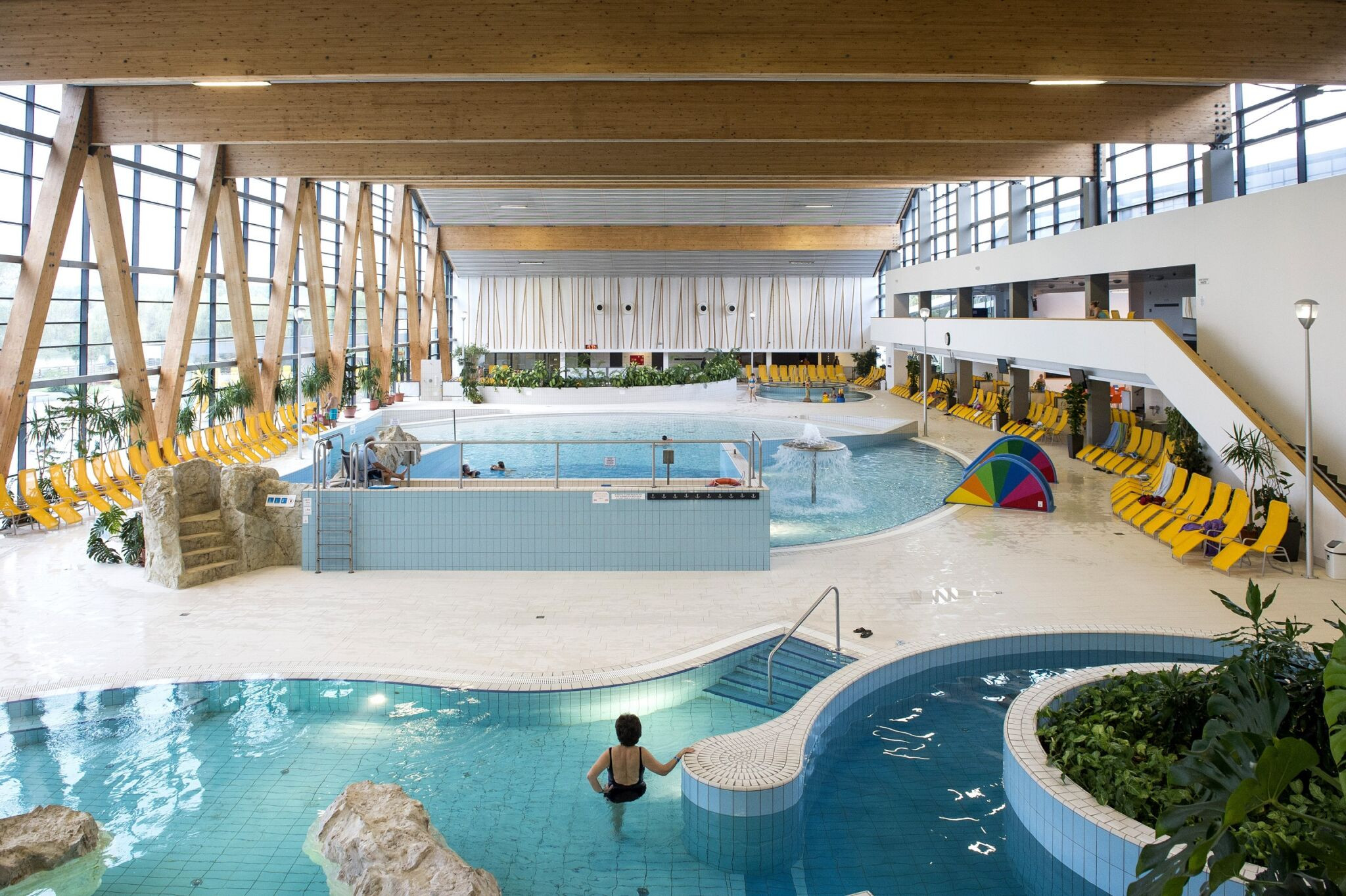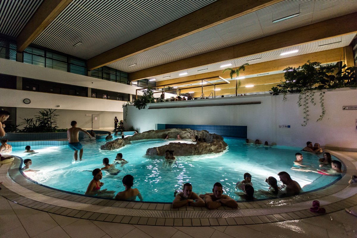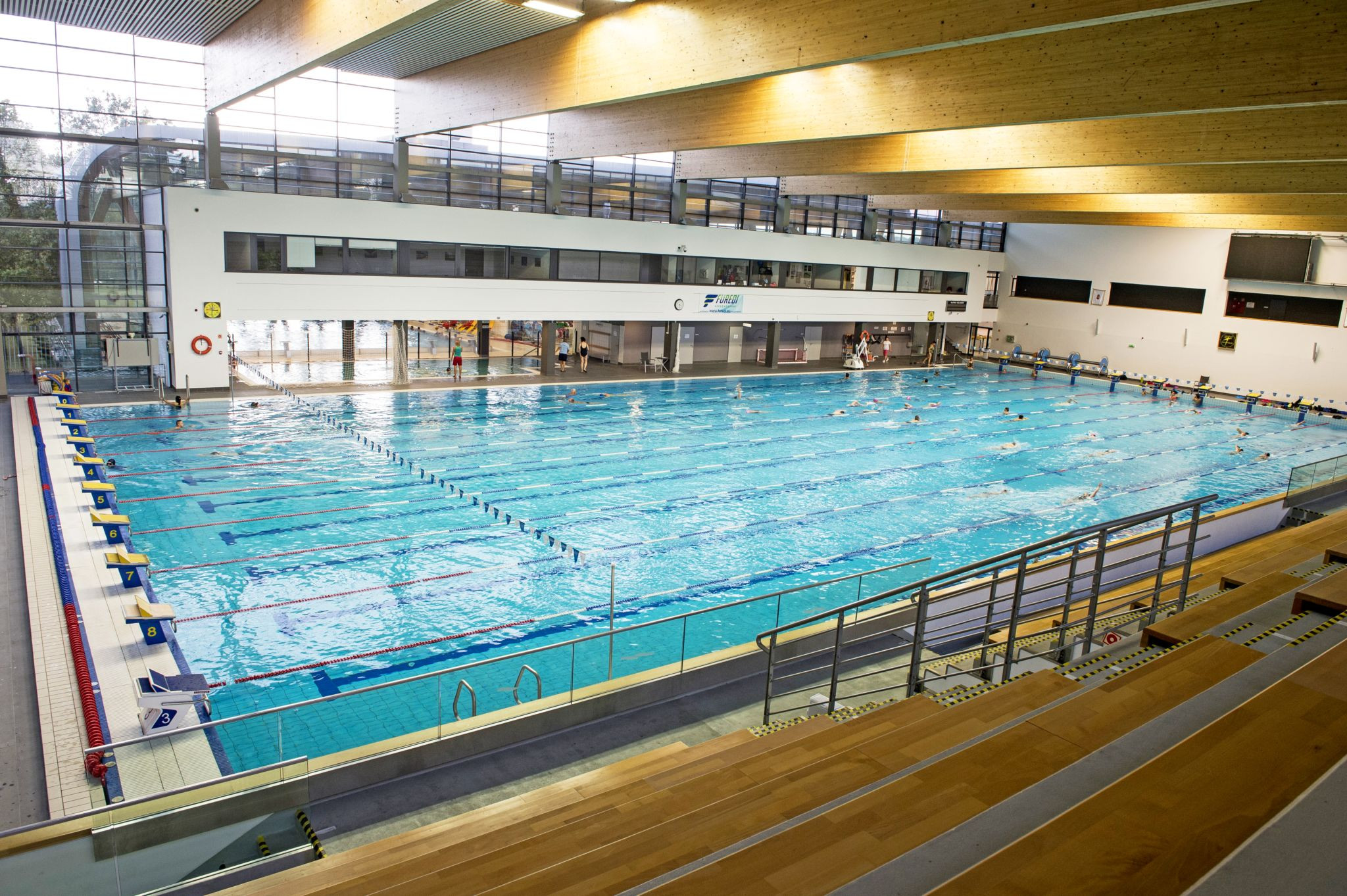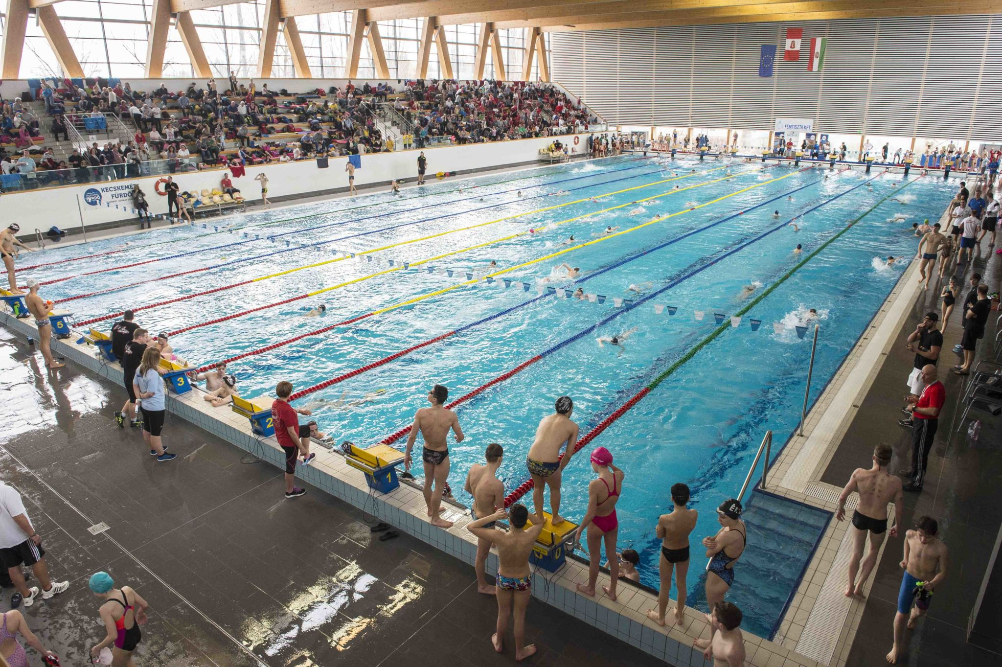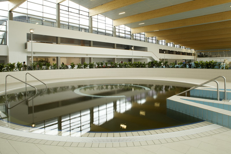 On the ground floor, there is a competition swimming pool with a 700-seat grandstand, a warm-up pool, a leisure bath, a sauna world, a wellness area, guest changing rooms, a lobby, a restaurant, and a kitchen capable of serving 200 meals.