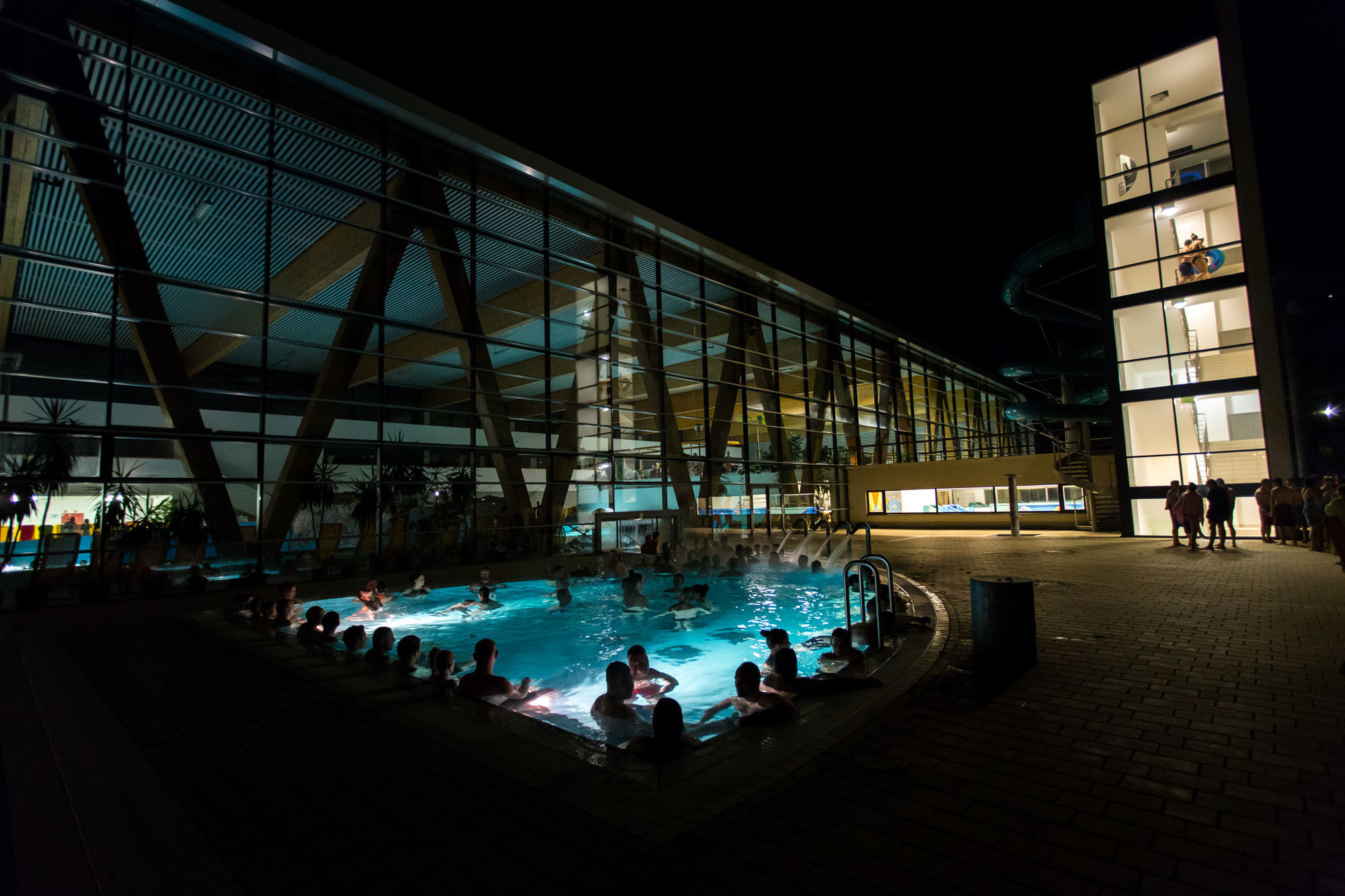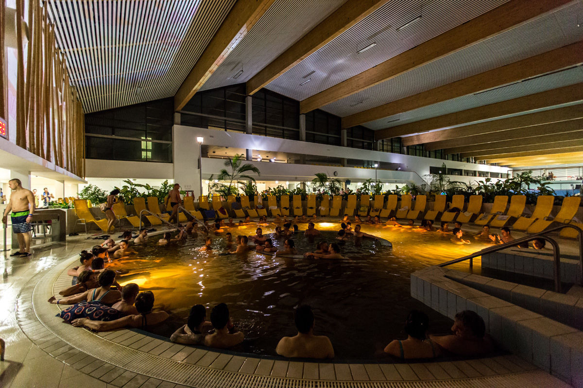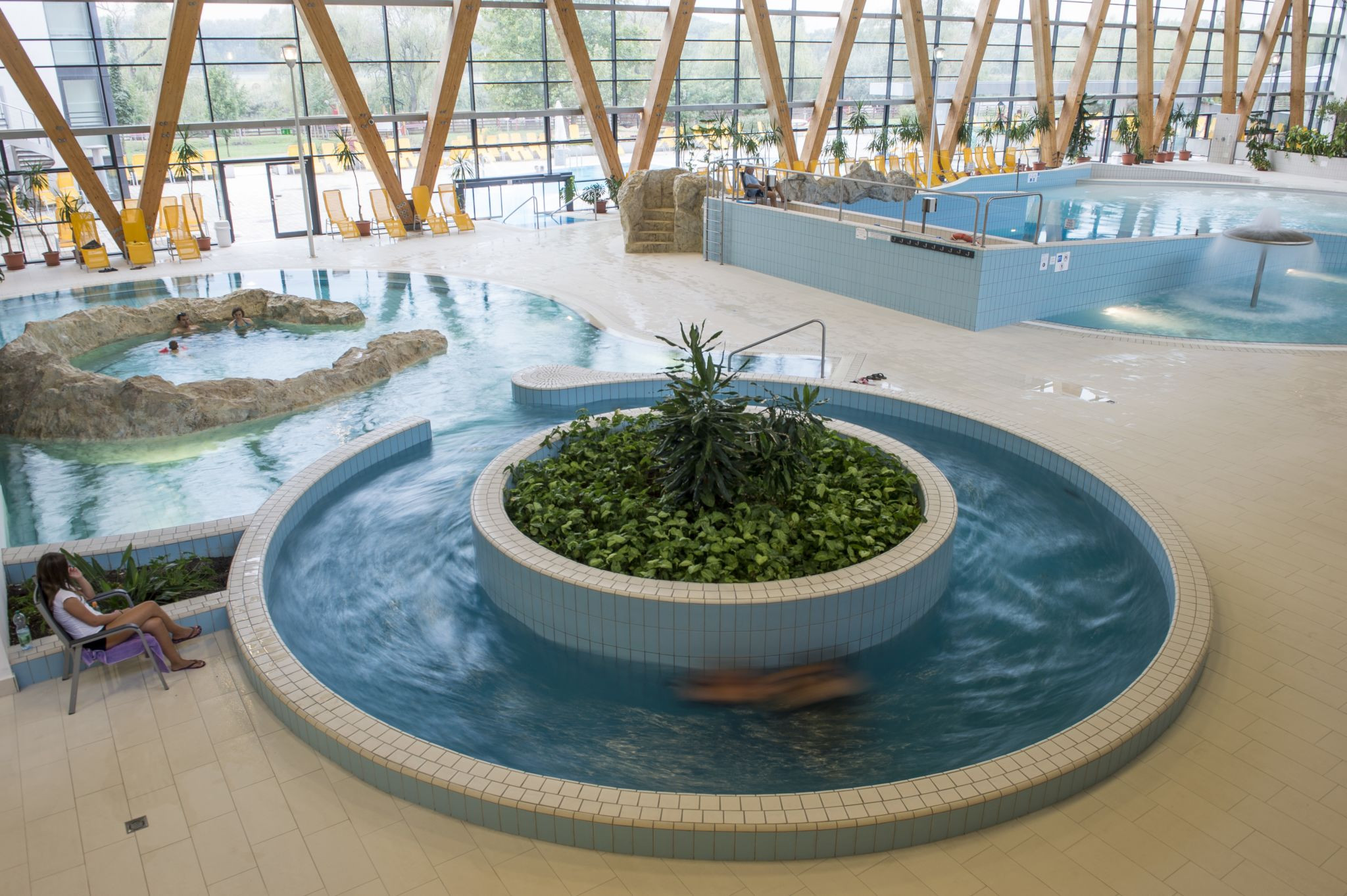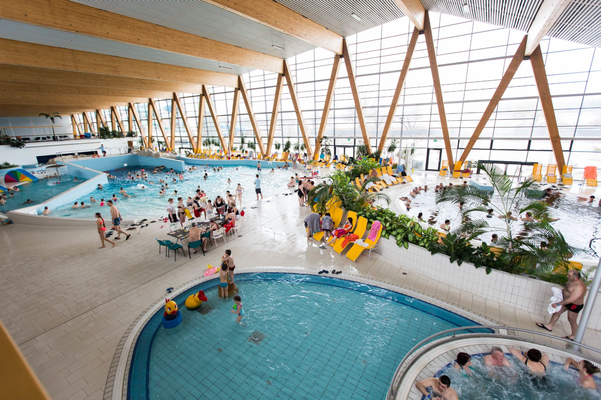 On the ground floor, there is a competition swimming pool with a 700-seat grandstand, a warm-up pool, a leisure bath, a sauna world, a wellness area, guest changing rooms, a lobby, a restaurant, and a kitchen capable of serving 200 meals.