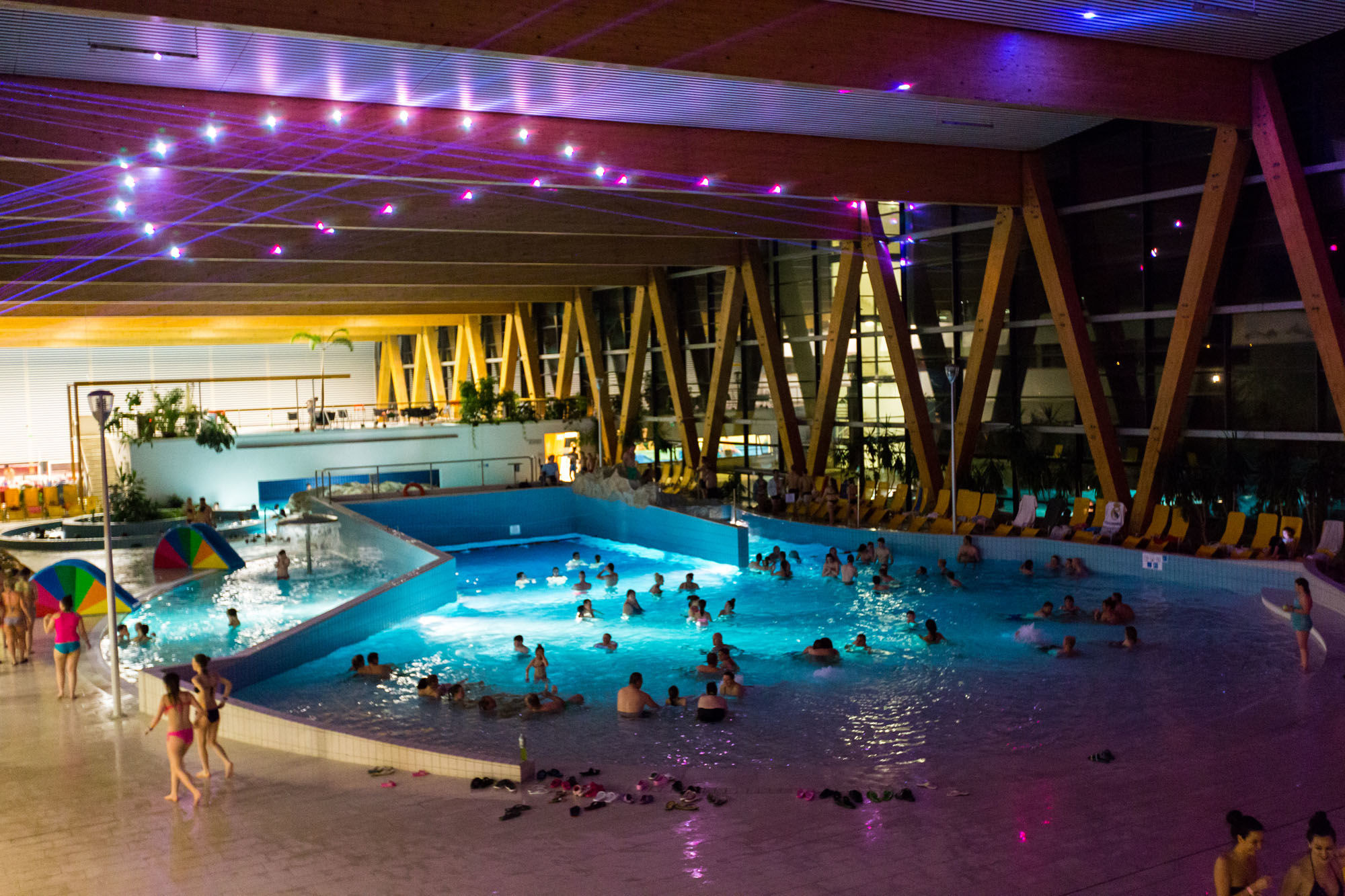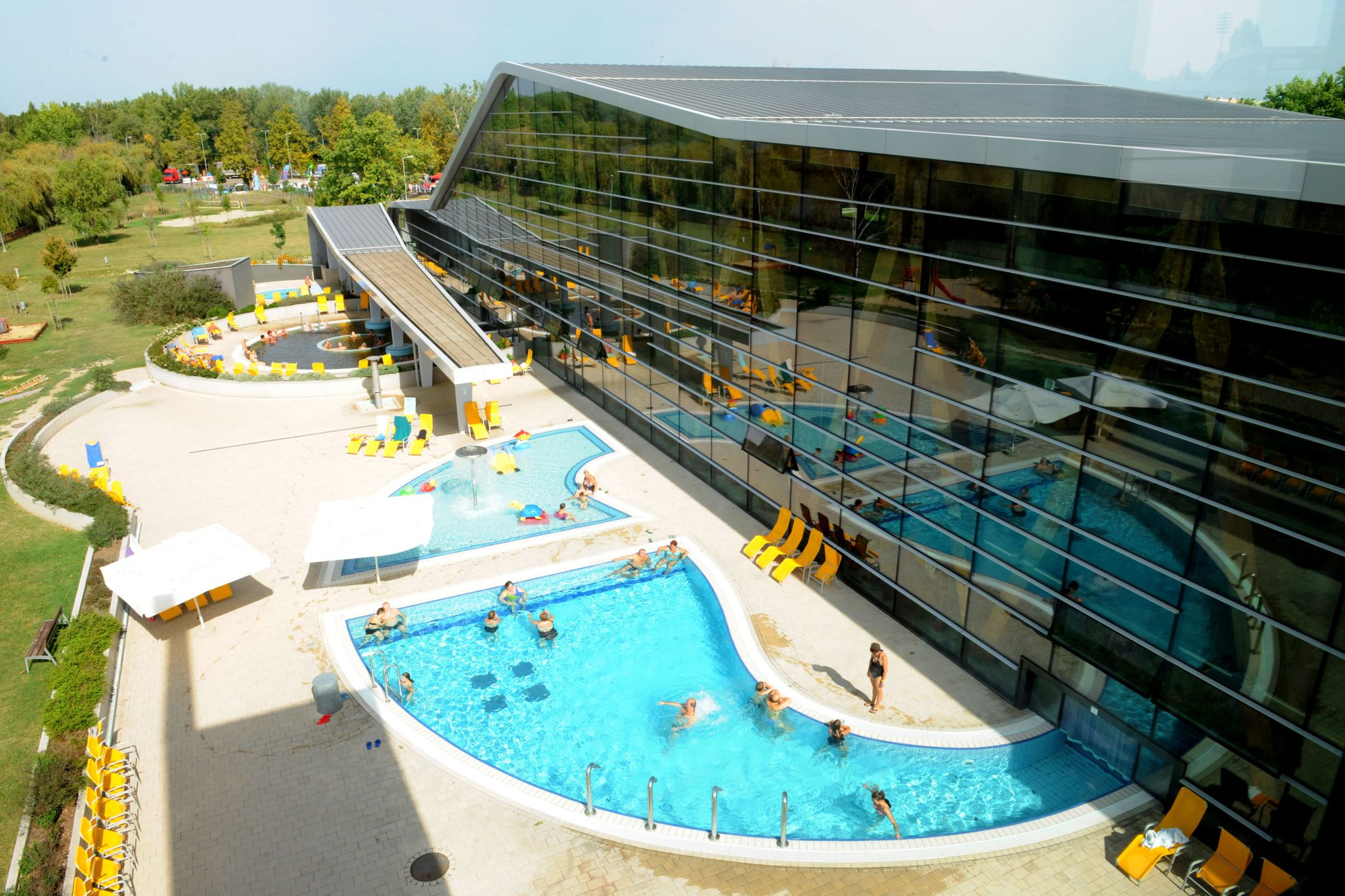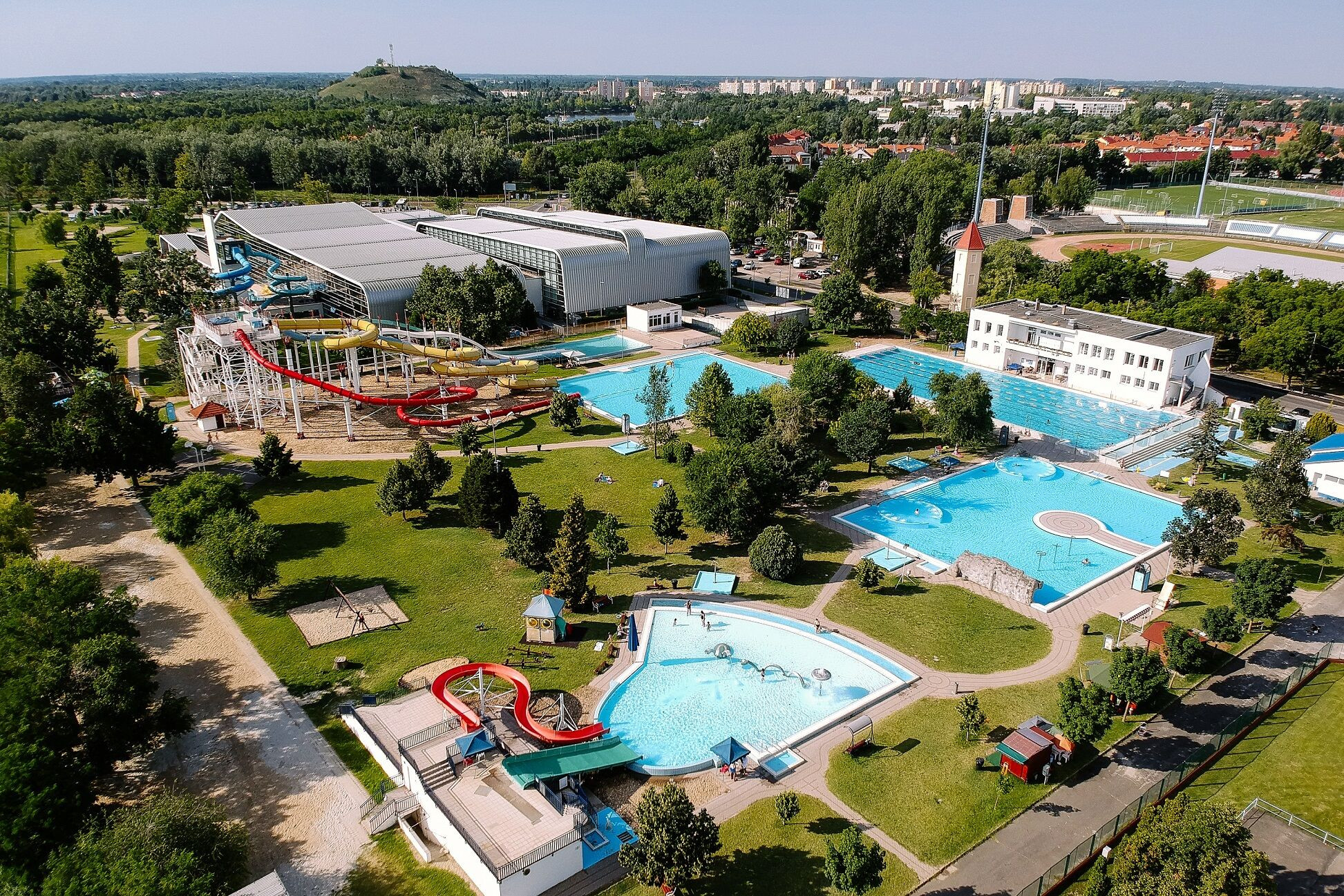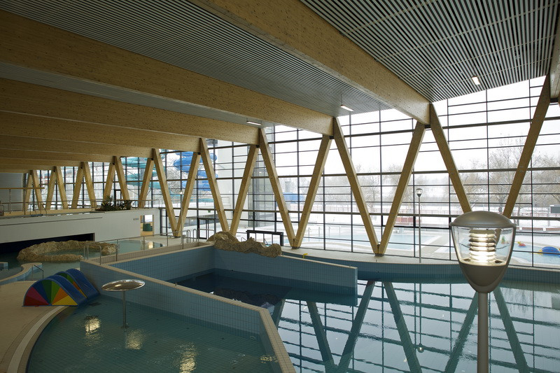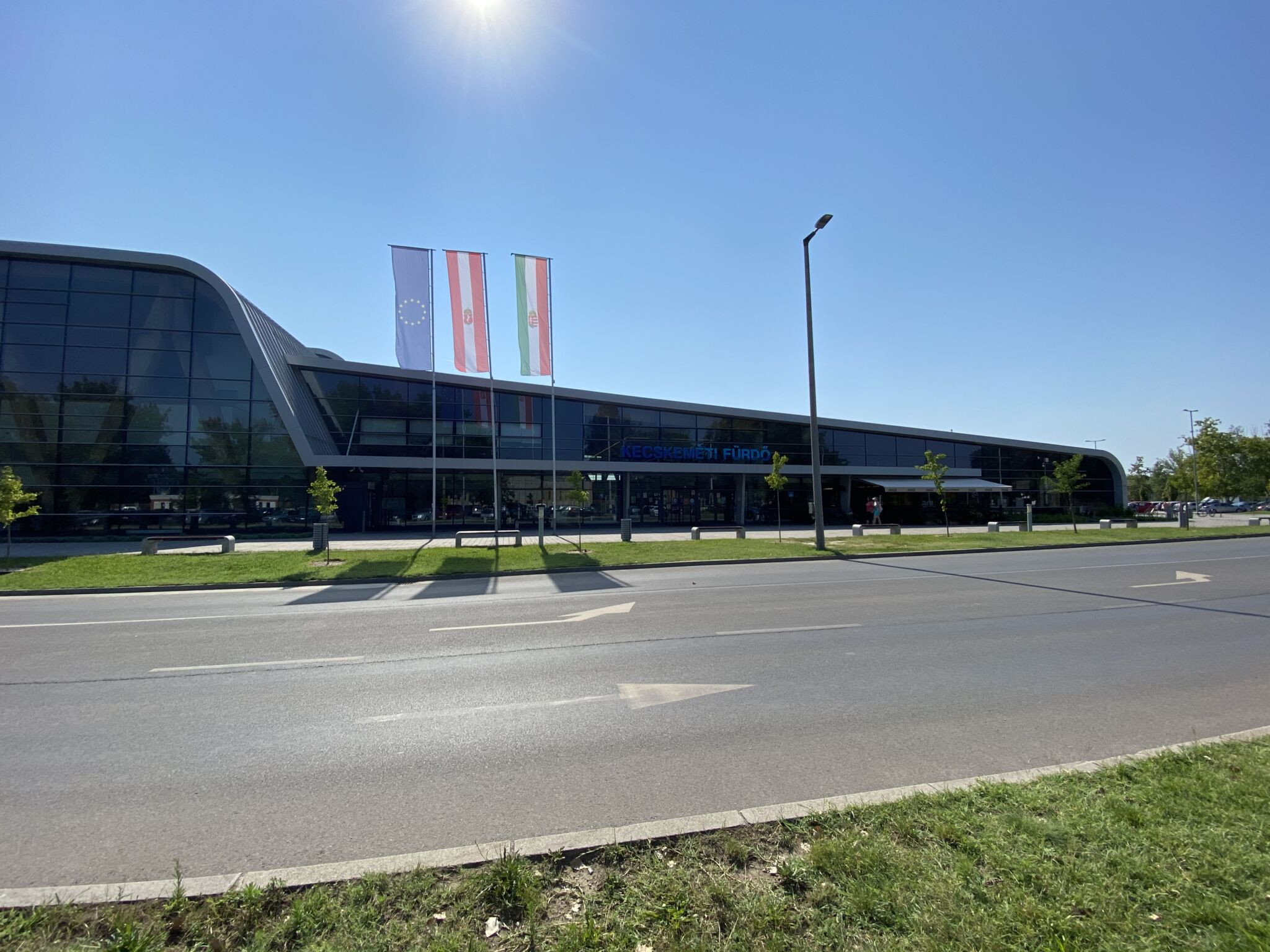In Kecskemét, a new competition swimming pool and leisure bath were constructed next to the existing open-air swimming complex. The design and construction — which required intensive on-site designer supervision — took place between 2009 and 2012. The building is characterised by an attractive appearance as well as modern design and equipment. The three-storey complex features storage rooms, service areas, staff changing rooms, and water circulation machine rooms in the basement.