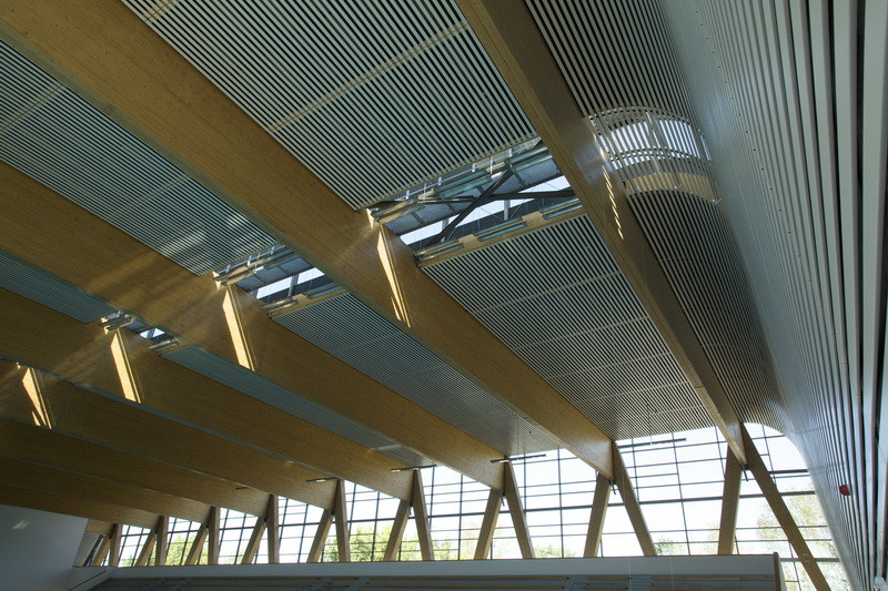 The first floor accommodates fitness areas, athletes' changing rooms, a relaxation zone connected to the leisure bath, boiler rooms, HVAC machine rooms, and rooms related to competition operations (such as doping control, sports medicine, offices, VIP lounge, etc.). Ventilation equipment is placed on the roof.