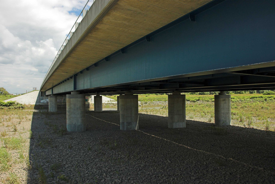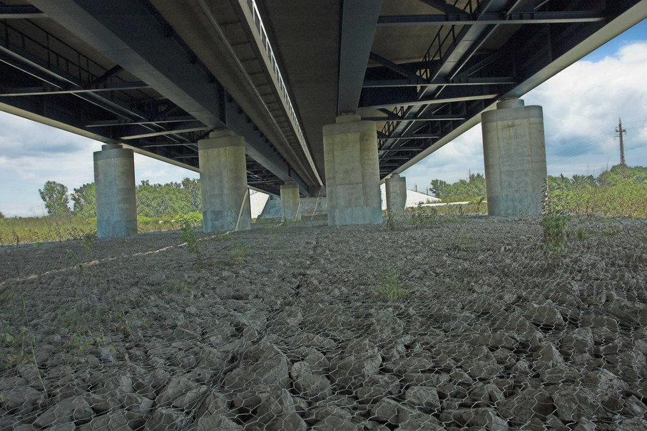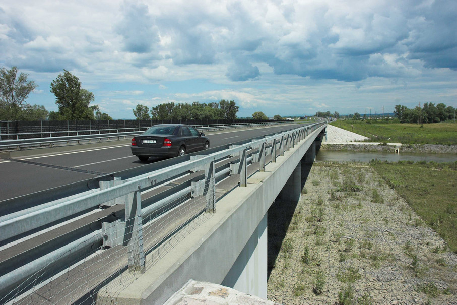 Length: 117.06 m. The composite structure is made up of a multi-support steel structure of two principal girders, three spans and reinforced concrete bridge deck. Bridge foundation: prefabricated driven piles.