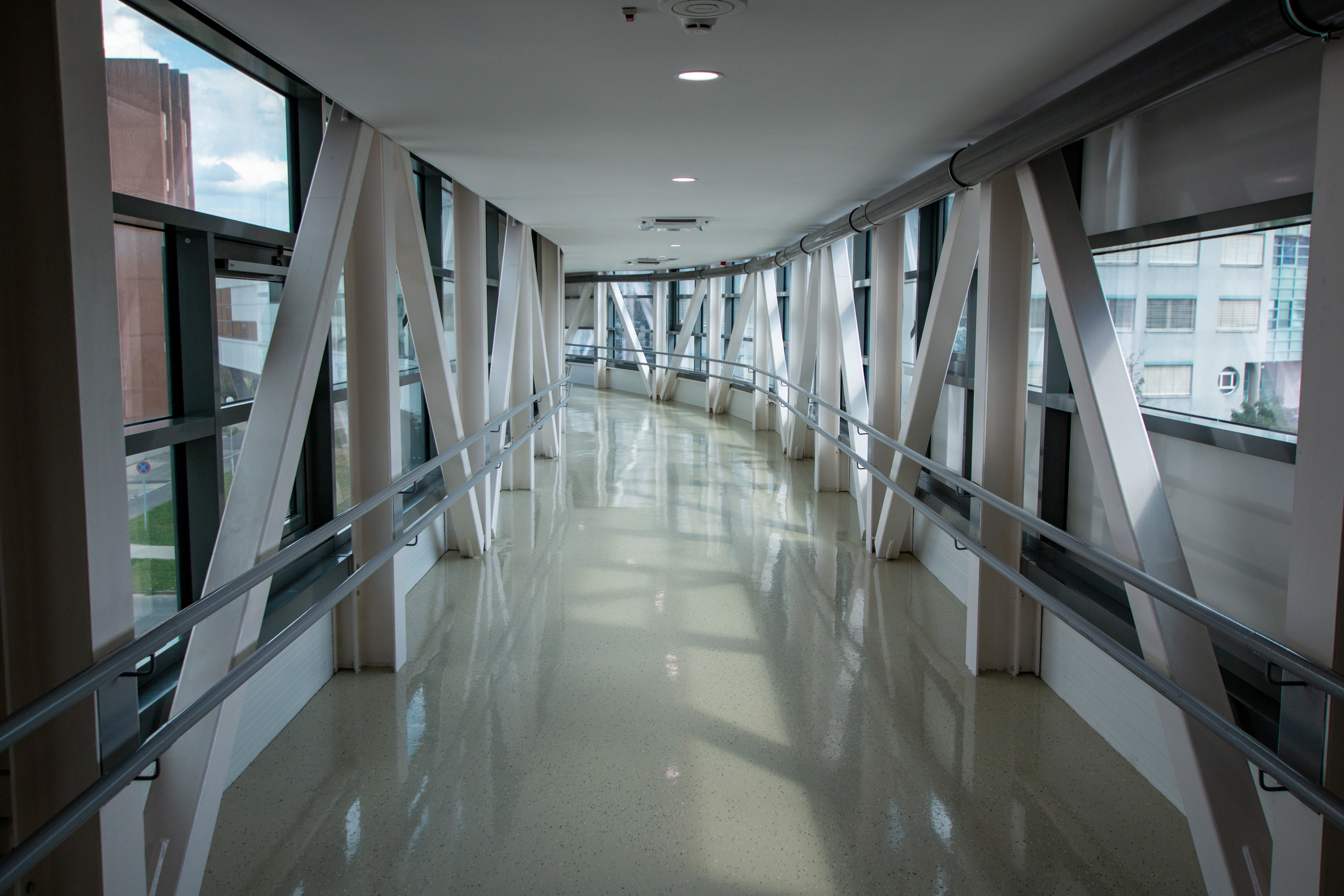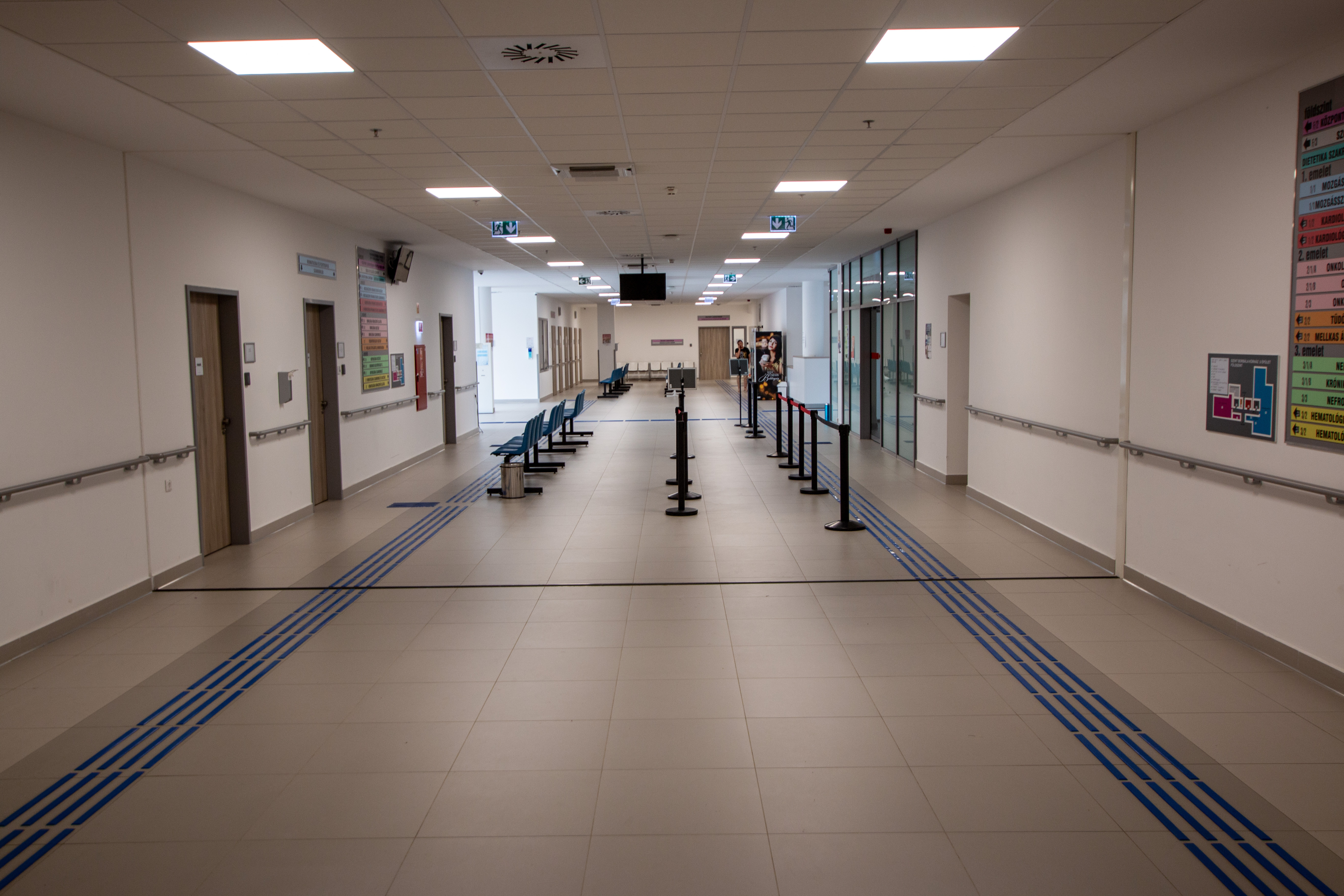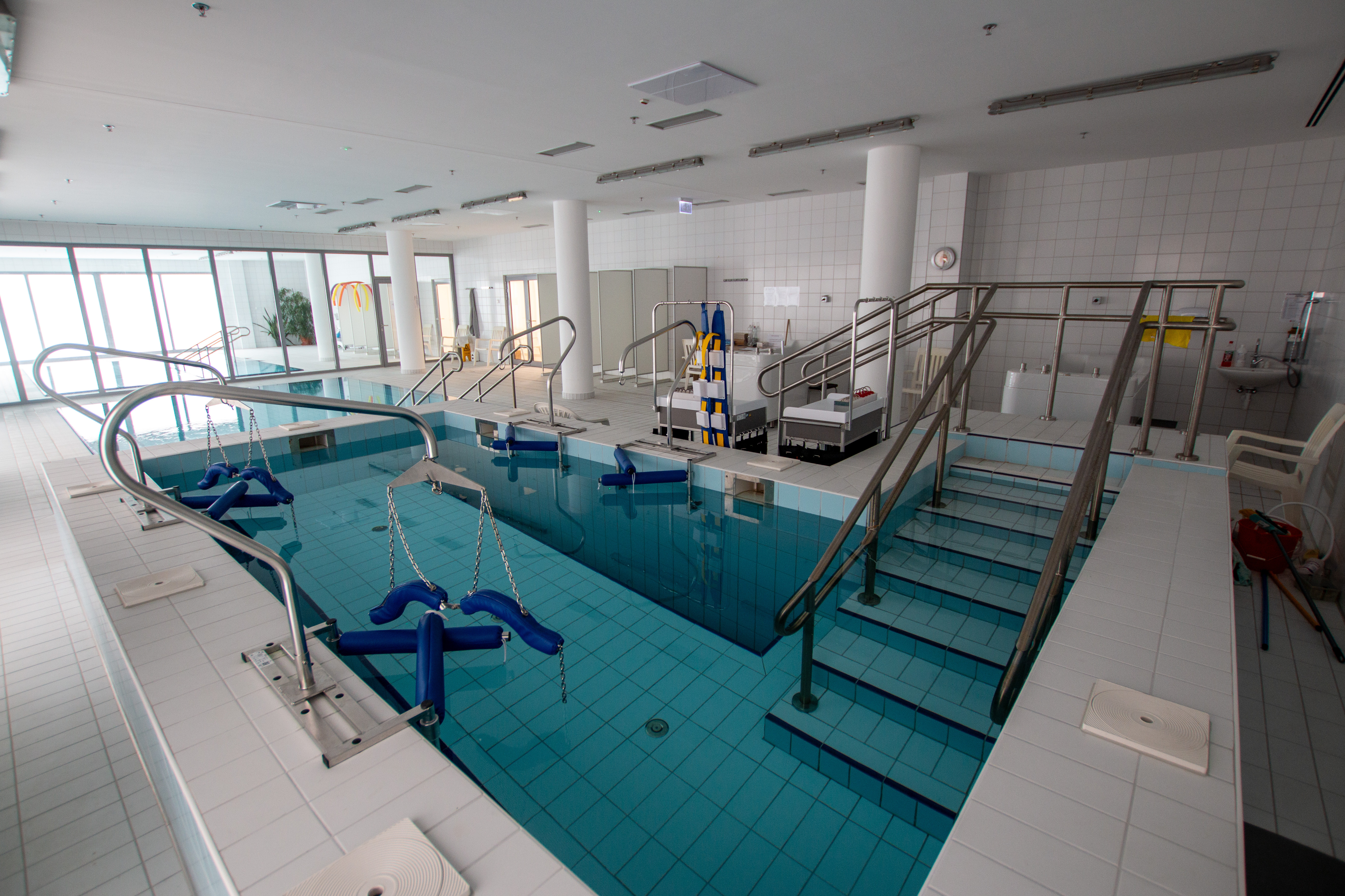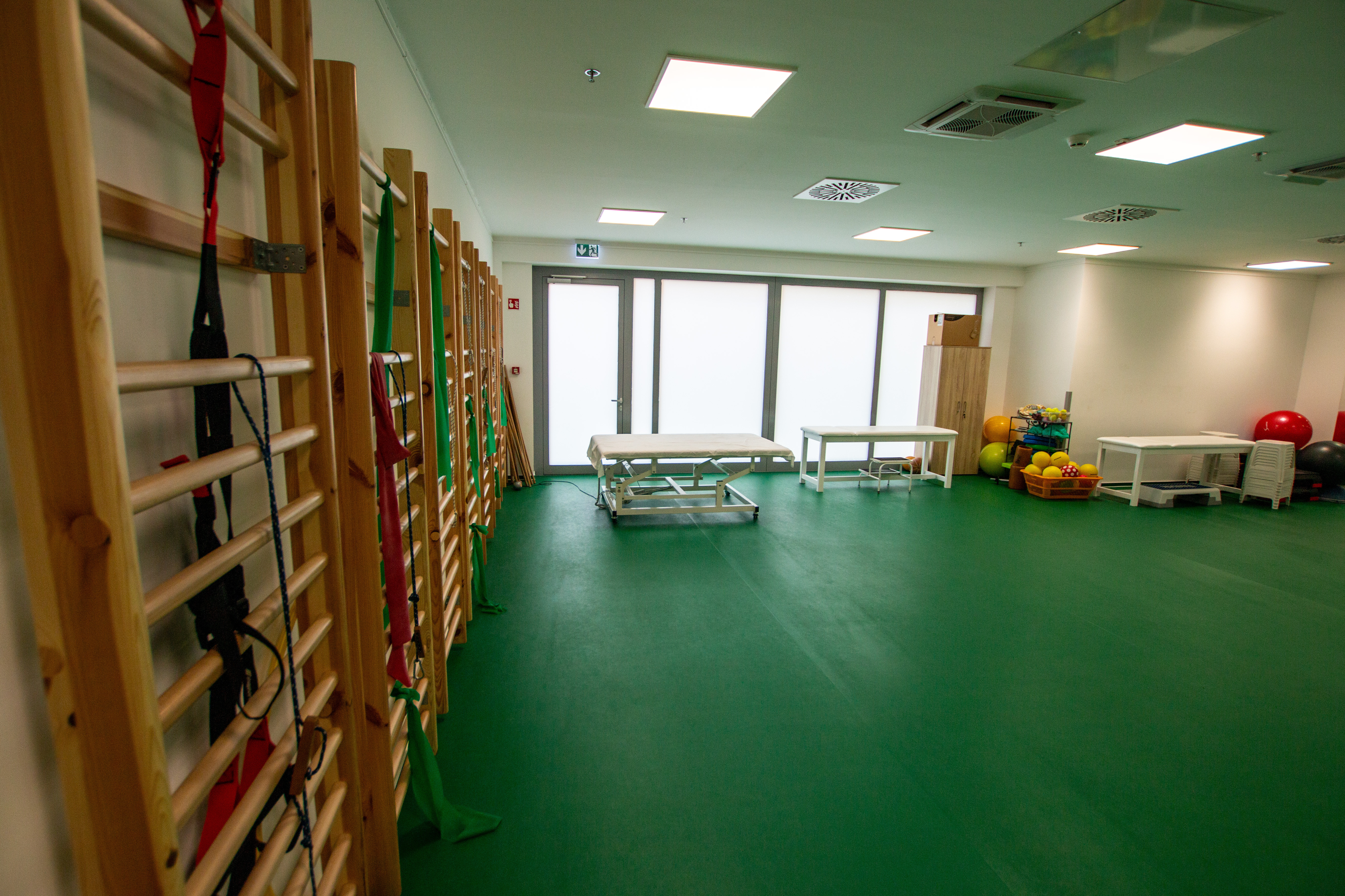 The new “U” building houses inpatient wards, a laboratory, an admissions office, and a spa and physiotherapy center also accessible to outpatients. The new building is connected to the former “B,” “C,” “L,” and “H” buildings via enclosed corridors and bridges.