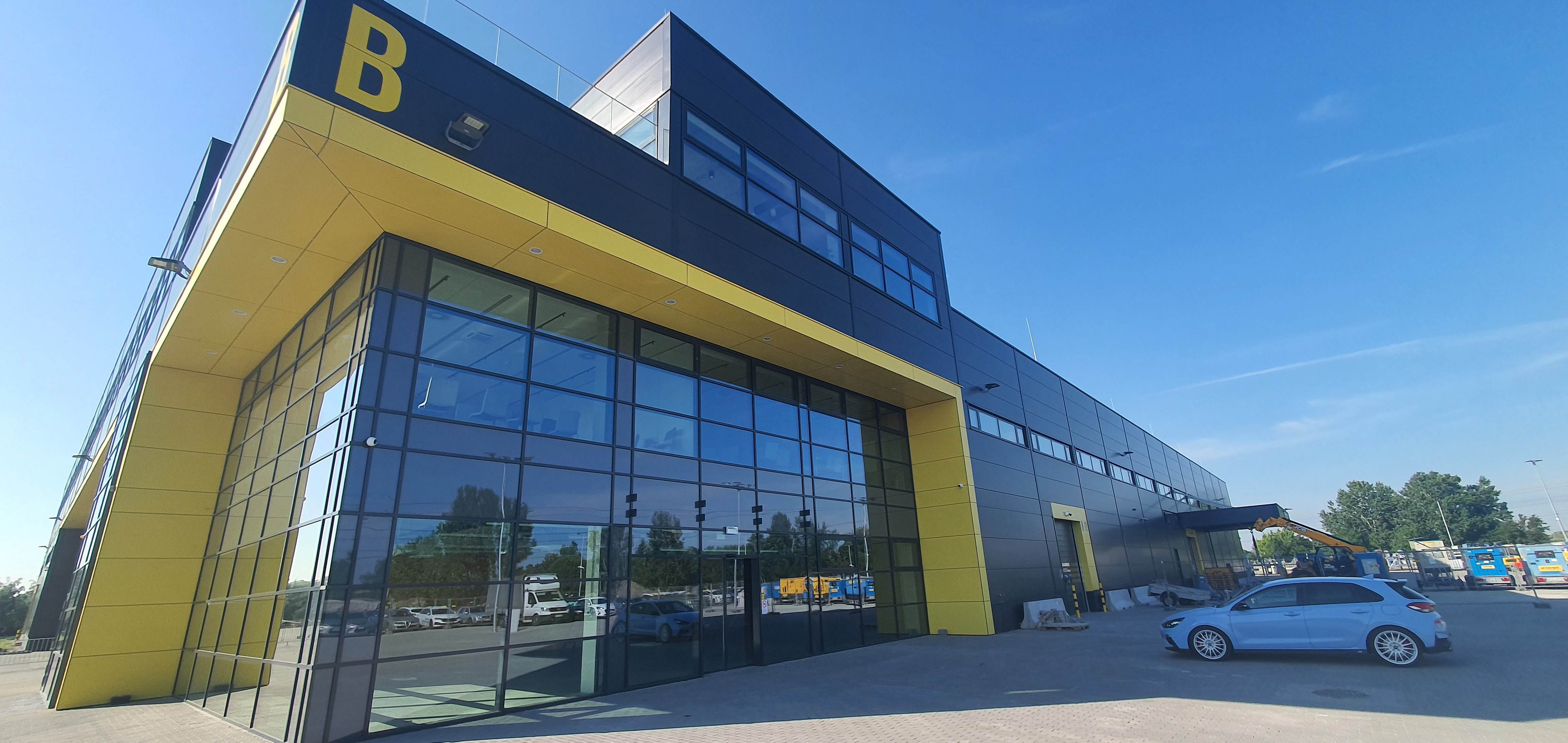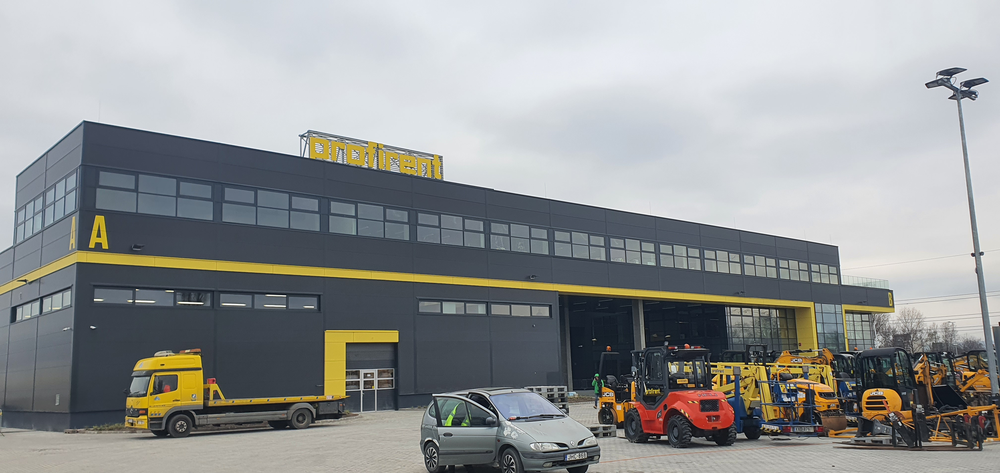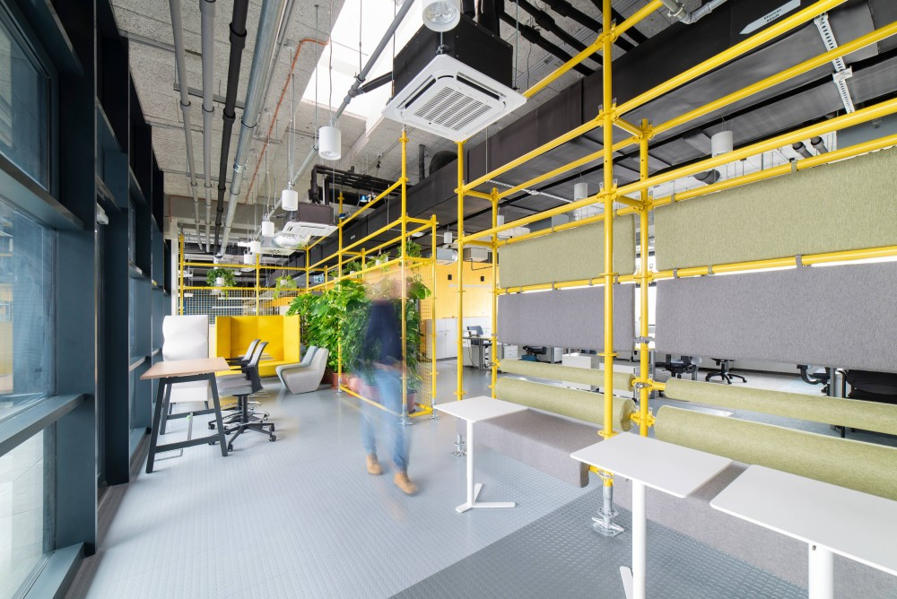 Profirent's main profile is the rental of machines, equipment, large and small machinery, lifts, generators, elevators, scaffolding, fences, etc. When designing their new office, they wanted this activity to be reflected in the interior spaces in some form. They envisioned a concept that blends the world of office workers and those primarily engaged in physical labor, elevating machine parts, scaffolding, and pipes to an artistic level.