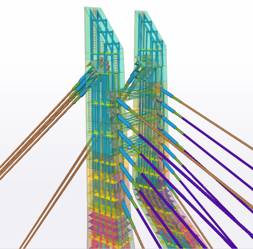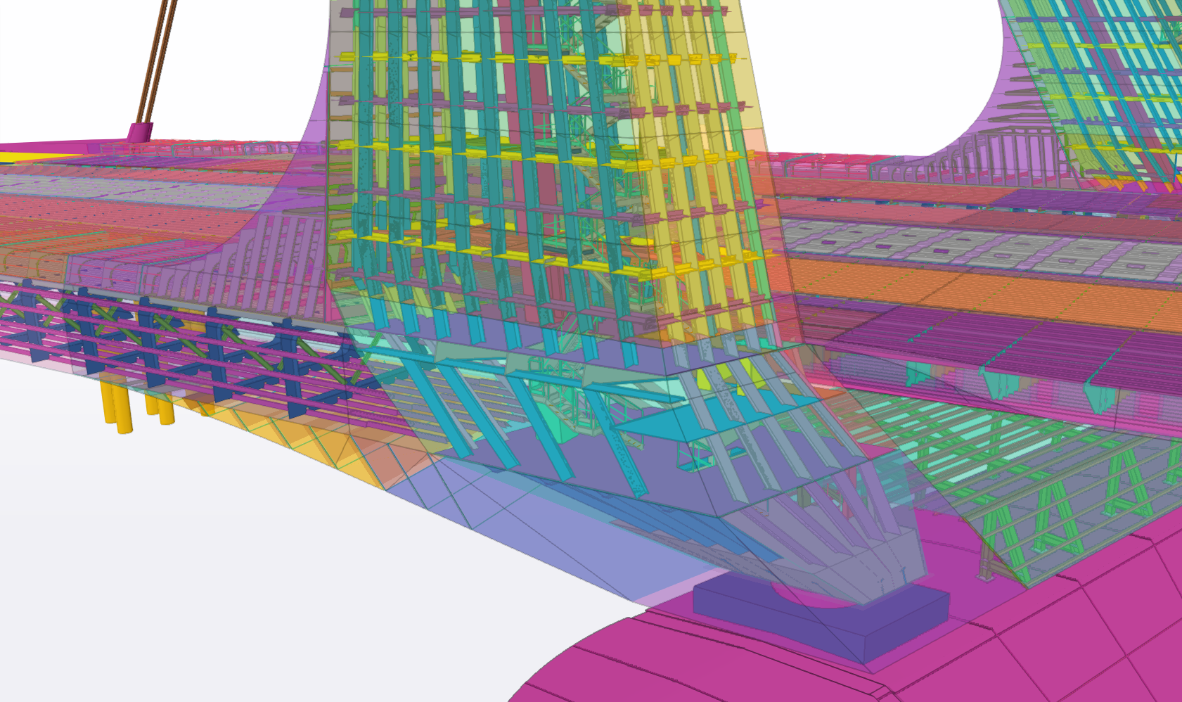 The complexity of the designed geometry made the application of a co-ordinated 3D model essential. The fundamental geometry was provided by the architectural Rhino model of UN Studio, which was further refined by the bridge engineering team, which used it to create the structural designs applying Tekla Structures.