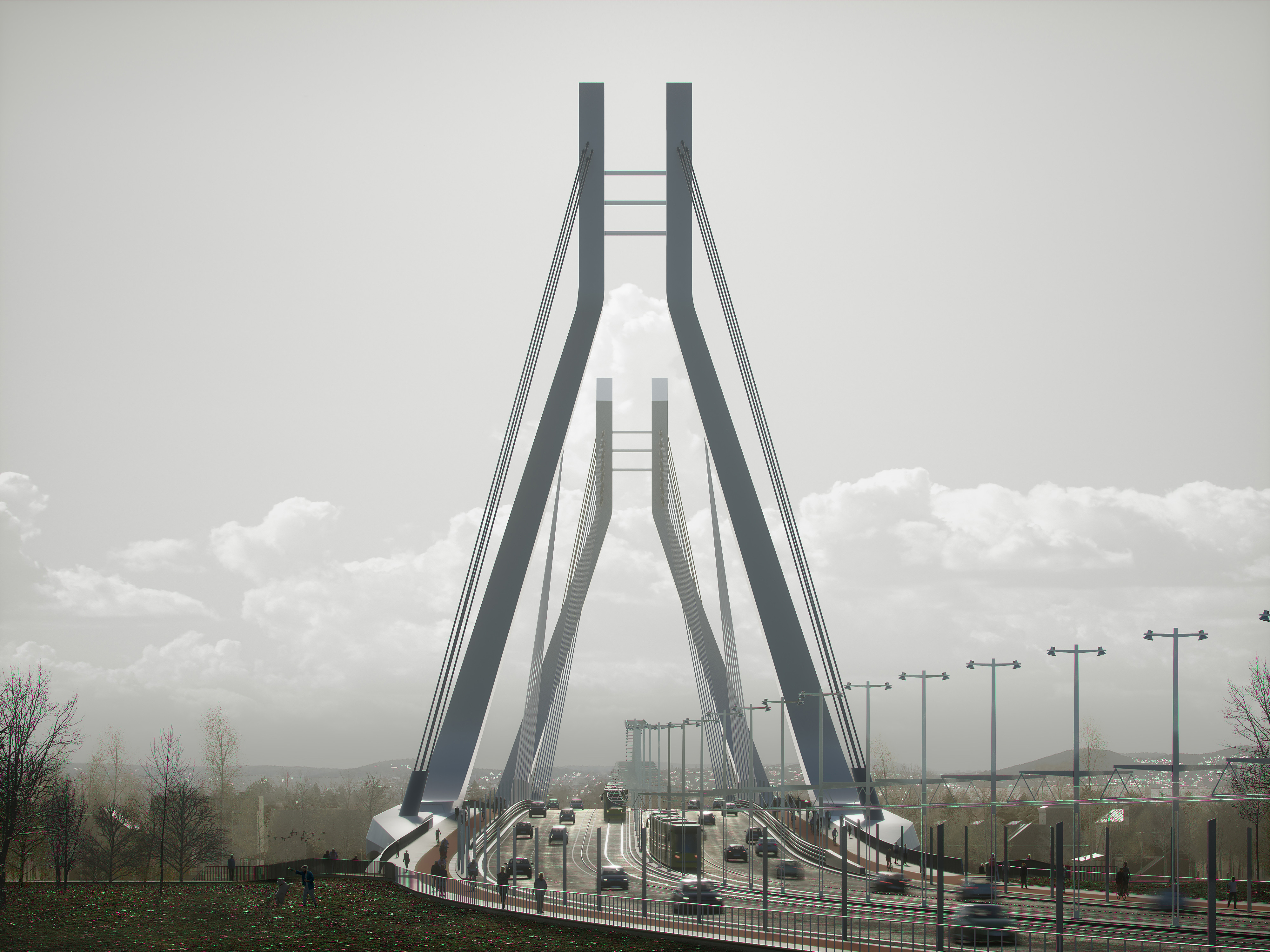 The length of the five-span bridge: 546m; the spans: 29+111+246+111+29 m. Due to the site constraints the skewness of the bridge is 73o. The superstructure of the approach spans has a traditional composite structure. They are made unique by the steel structure architectural edge beams running along the edges of the bridge, which ensure transition between the pronounced edge beams of the main bridge and the retaining wall connected to the abutment. The main bridge itself is a 3-span, two-pylon stay cable structure. The side spans are continuous girders that do not make use of stay cables. The main support structure components of the side spans are closed-box cross-section edge beams. The main span is supported by 4x7 stay cables connecting to the pylons. A closed, orthotropic steel structure will be constructed underneath the walkways, bicycle routes and public road lanes along the full length of the main bridge, while an open, double-planed steel ladder beam structure with RC slab is to be constructed under the public transport lanes. The main visual components of the bridge are the boat-shaped RC river piers and the slanted double-footed steel pylons featuring a varied quadrilateral cross-section.